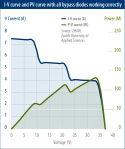 O aparelho testa não somente a potência, mas também o funcionamento dos diodos by-pass, que garantem a geração e protegem as células em situações de sombreamento parcial. Os diodos são testados, aplicando uma irradiância diferente em cada fileira interna do módulo. O diagrama U-I apresenta claramente eventuais defeitos.