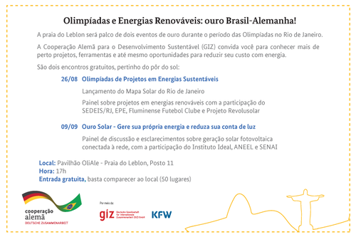 A cooperação alemã GIZ, junto com o Instituto Ideal, aproveita as Olimpíadas para promover dois eventos sobre energias sustentáveis. O primeiro, no dia 26/08, foca em projetos de energia sustentáveis. Já o segundo, no dia 9/9 oferece um painel de discussão sobre geração solar fotovoltaica conectada à rede.