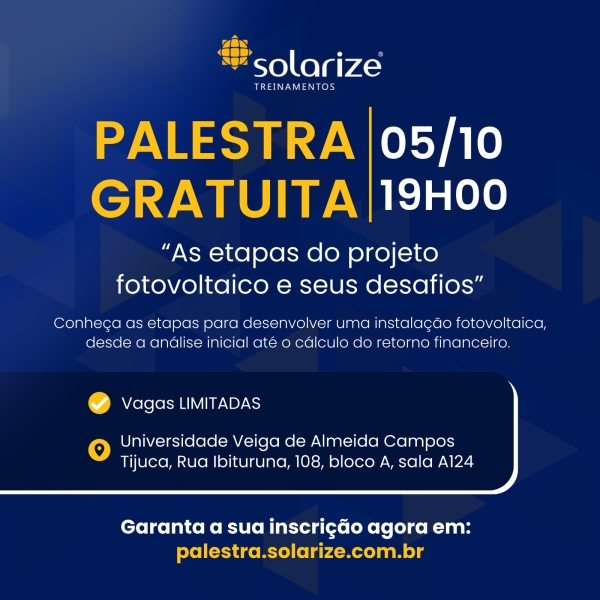 Palestra gratuita, RJ: As etapas do projeto fotovoltaico e seus desafios