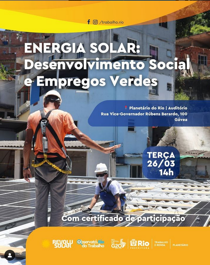 A secretaria municipal de trabalho e renda (SMTE) do município do Rio de Janeiro, em parceria com a Revolusolar, associação sem fins lucrativos, está realizando um estudo inédito sobre os desafios e oportunidades do mercado de trabalho de energia solar na cidade.
