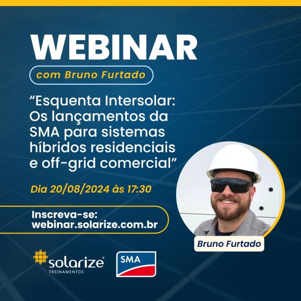 No dia 20/08, às 17:30, receberemos o engenheiro Bruno Furtado, da SMA, a apresentar as novidades, dando spoiler para a Intersolar.