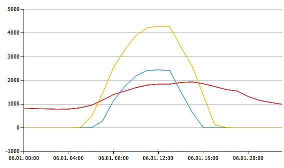 O que é imprescindível para esse cálculo é a curva de carga do consumidor ao logno do dia. Afinal de contas, toda a energia que poderia ser gerada além do consumo será descartada através de uma regulagem do inversor. O gráfico ao lado, produzido no próprio PV*SOL, mostra como exemplo a curva de consumo (vermelha), a da geração (amarela) e a da energia injetada (azul).