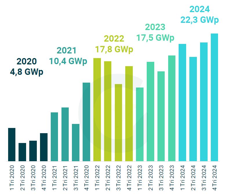 Após uma estagnação em 2023, o mercado voltou a crescer em 2024. Foram 27% a mais em módulos importados, totalizando 22,3 GWp.