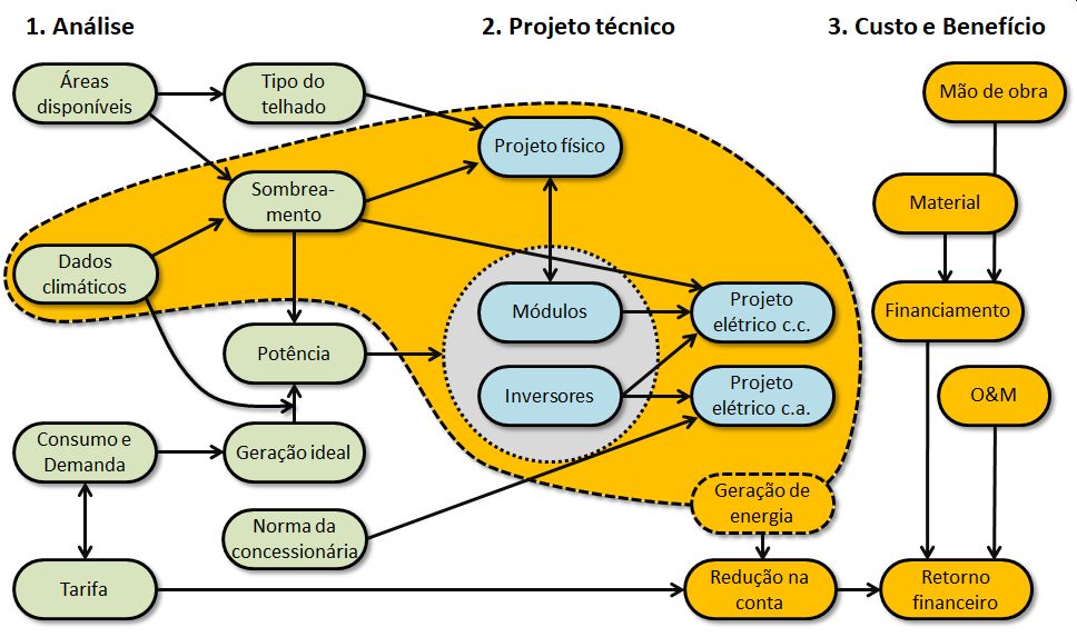 Cada projeto fotovoltaico é elaborado seguindo as três etapas Análise - Projeto - Custo e Benefício.